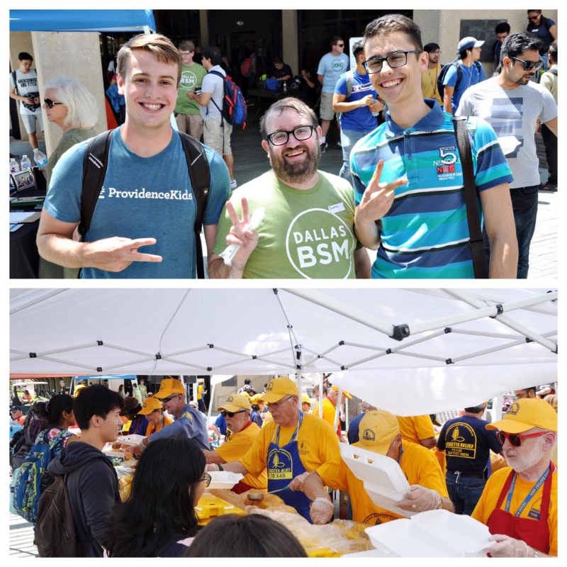 Photo: (Top) Jourdan, our BSM staff member, poses with Ben and Emil, two new UTD Freshmen. (Bottom) Texas Baptist Men cooked and served lunch for 1,200 students during our Annual BSM Fajita Feed outreach lunch.